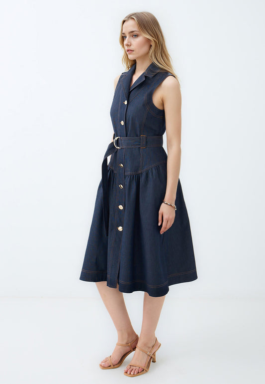 Sleeveless Midi Dress with Double Breasted Belt Detail