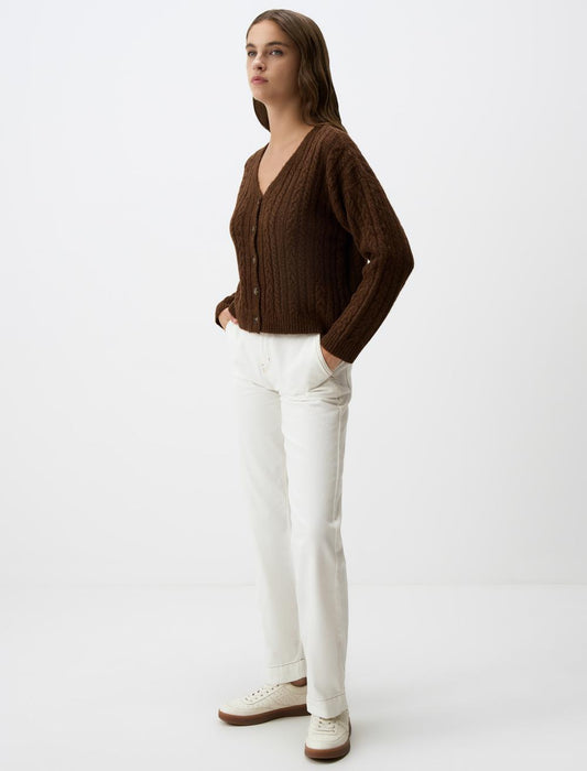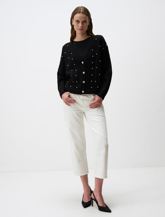 V-Neck Loose Fit Pearl Detail Knit Cardigan