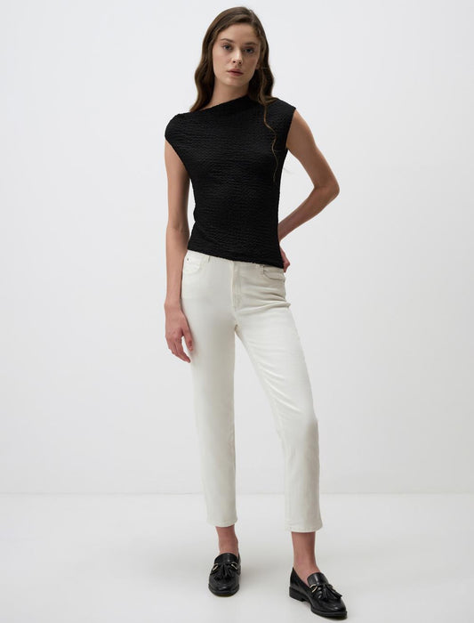 Slim Fit Asymmetric Collar Patterned Sleeveless Mesh Knitted Blouse