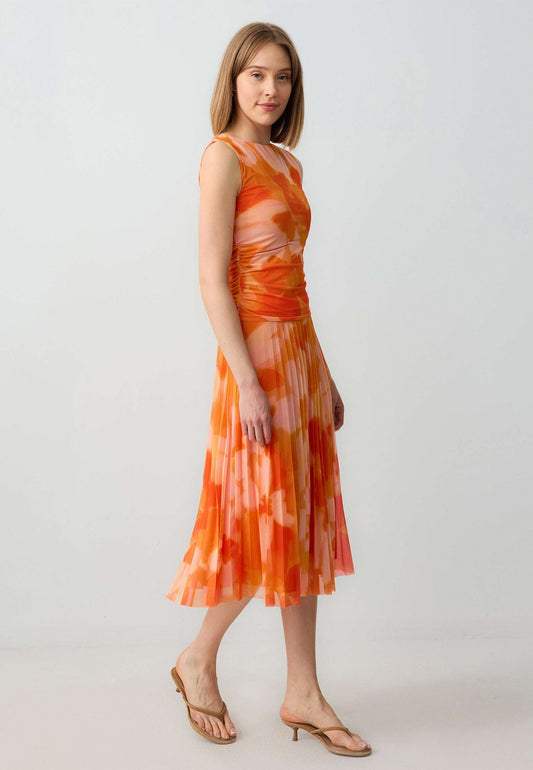 Regular Waist Pleated Floral Patterned Mesh Knitted Midi Skirt