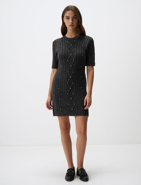 Slim Fitted Boat Neck Patterned Knitted Mesh Dress