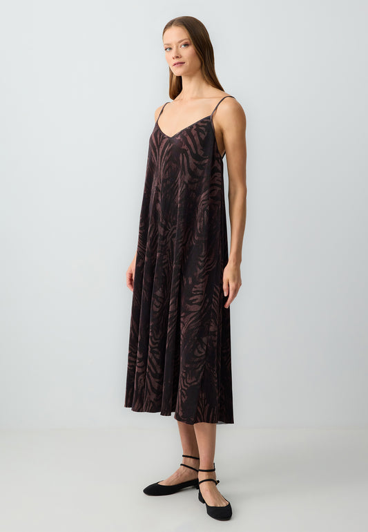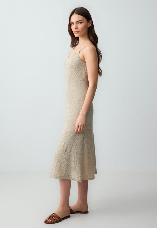 Slim Fitted Straps Open Neck Patterned Mesh Knitted Midi Dress