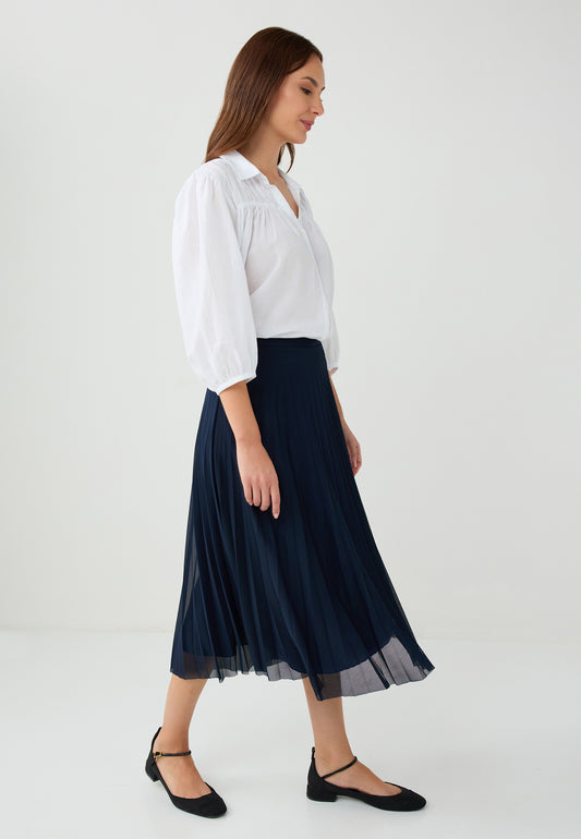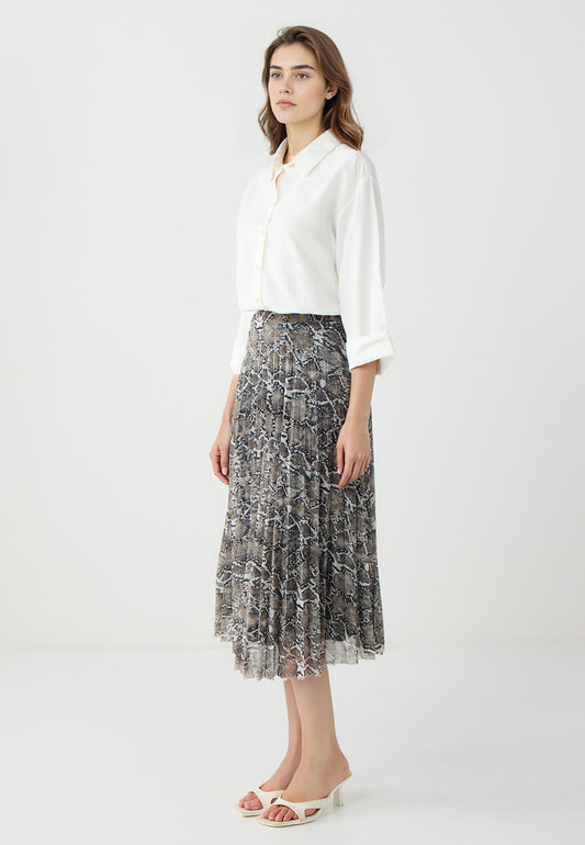 Regular Waist Pleated Floral Patterned Mesh Knitted Midi Skirt