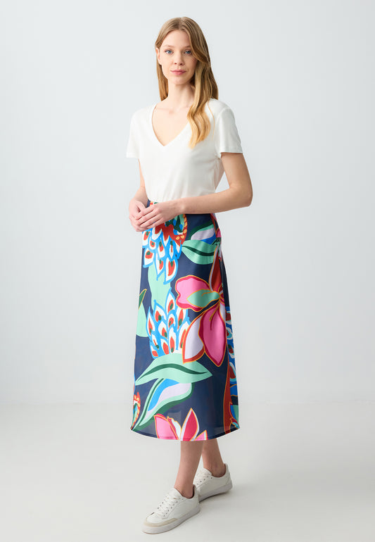 Regular Fit High Waist Midi Length Woven Multi-Coloured Skirt