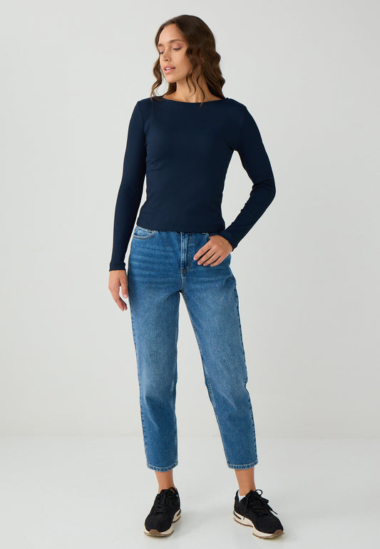 Slim Fit Off-the-shoulder Knitted Dark Blue Blouse
