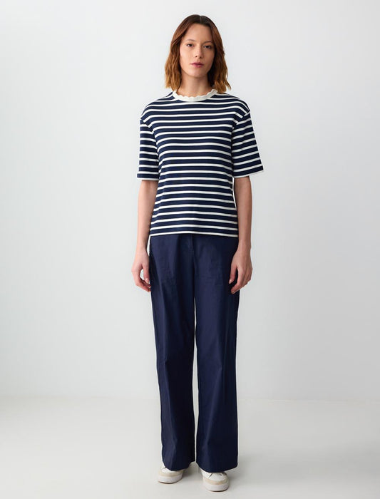 Round Neck Line Patterned Short Sleeve Linen T-Shirt