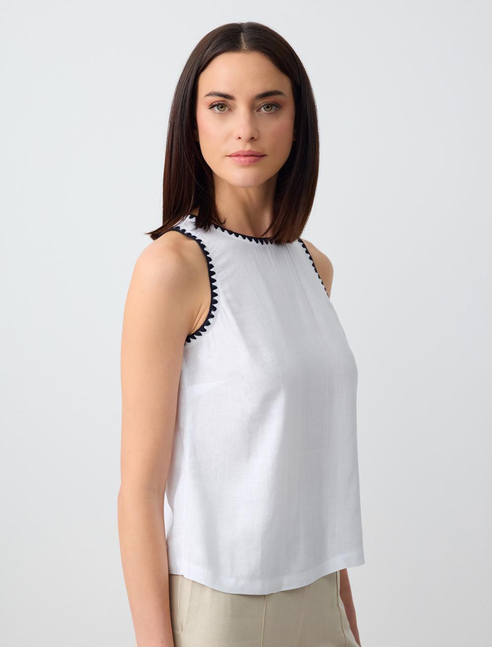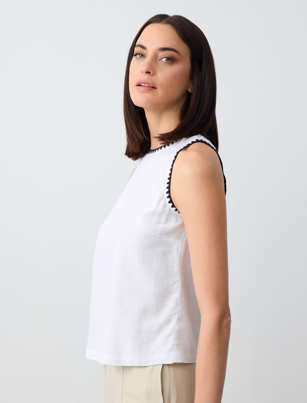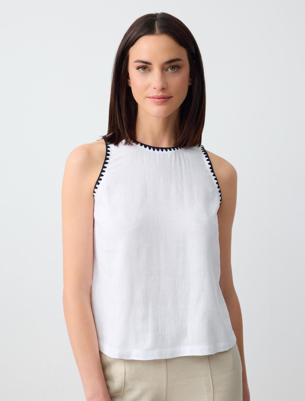 Crew Neck Sleeveless Embroidered Linen Blouse