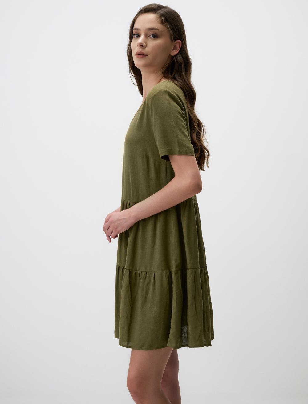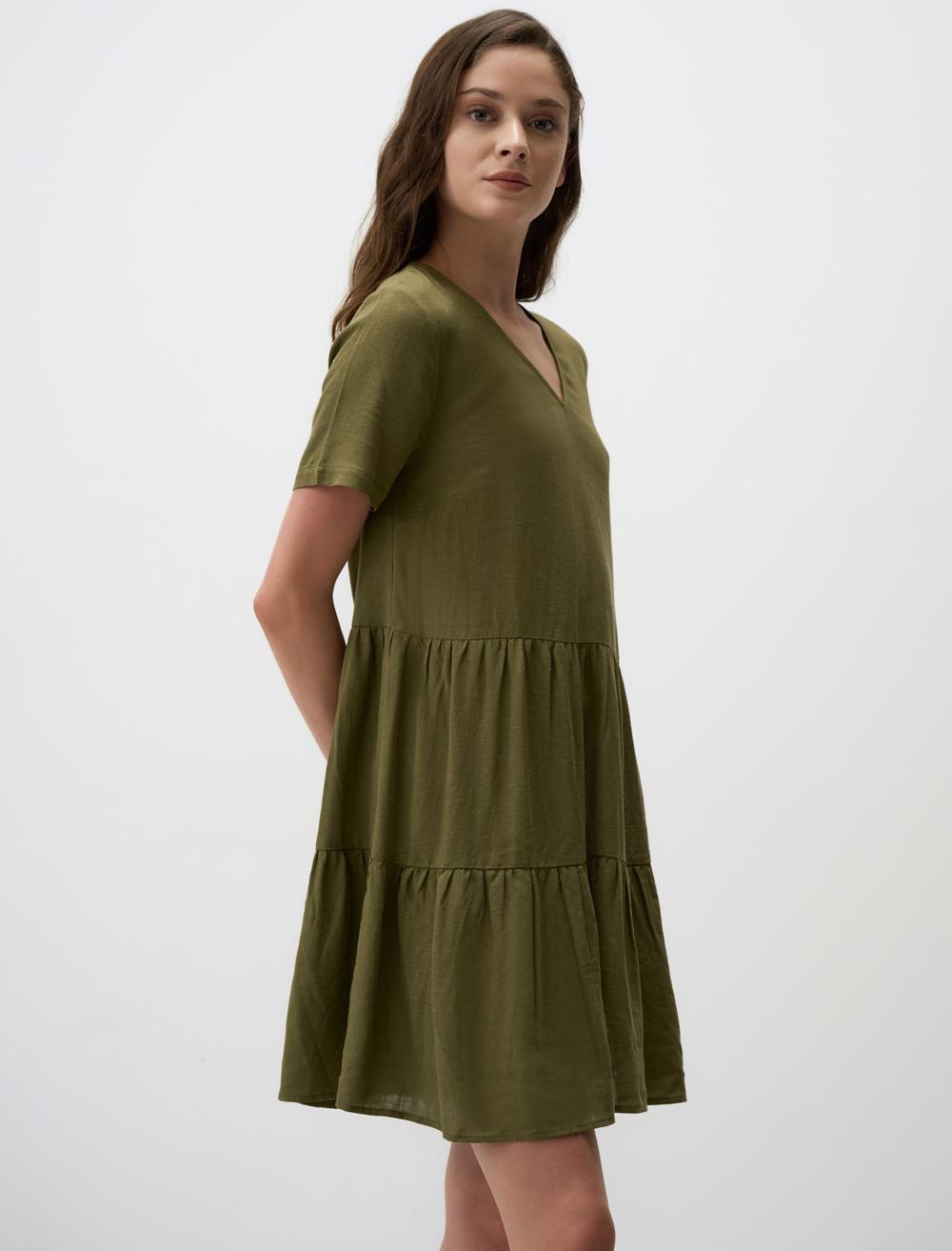 Loose fit V-neck Short Sleeve Short Woven Khaki Dress Fabric: %73 Viscon %27 linen Fit: Loose fit V-neck Length: Short S Model Size: 176 86 cm 62 cm 90 cm
