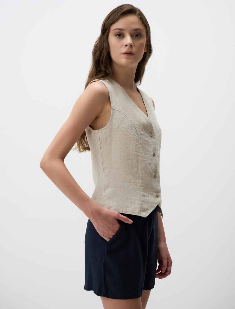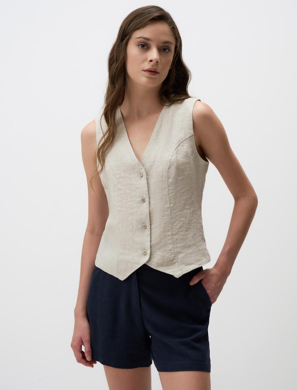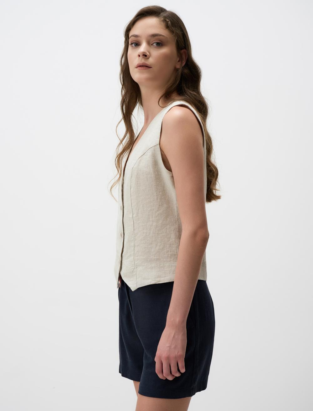 Slim Fit V-neck Sleeveless Short Woven Beige Waistcoat Fabric: %100 Linen Machine and hand wash at 30°C , No chlorine bleach , Iron in the low heat , Dry clean , Do not tumble dry , Wash and iron inside out Fit: Slim Fit V-neck Length: Short S Model Size: 176 86 cm 62 cm 90 cm