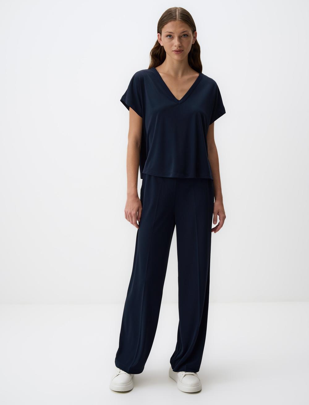 Loose fit V-neck Short Sleeve Normal Lenght Knitted Dark Blue Blouse Fabric: %100 Polyester Fit: Loose fit V-neck Length: Normal Lenght Model Size: S Model Height: 176 Model Breast: 82 cm Model Waist: 61 cm Model Hips: 88 cm