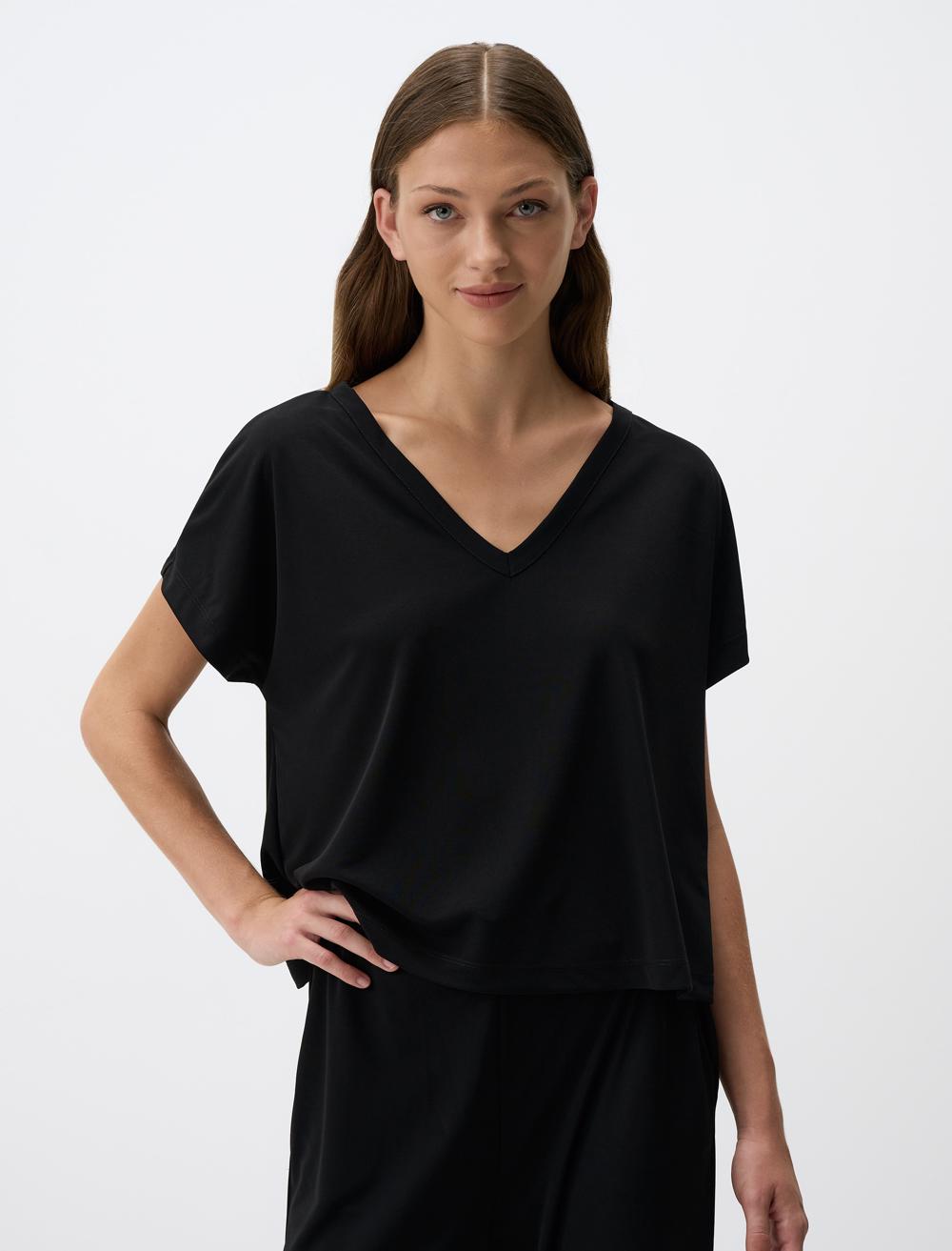 Loose fit V-neck Short Sleeve Normal Lenght Knitted Black Blouse Fabric: %100 Polyester Fit: Loose fit V-neck Length: Normal Lenght Model Size: S Model Height: 176 Model Breast: 82 cm Model Waist: 61 cm Model Hips: 88 cm