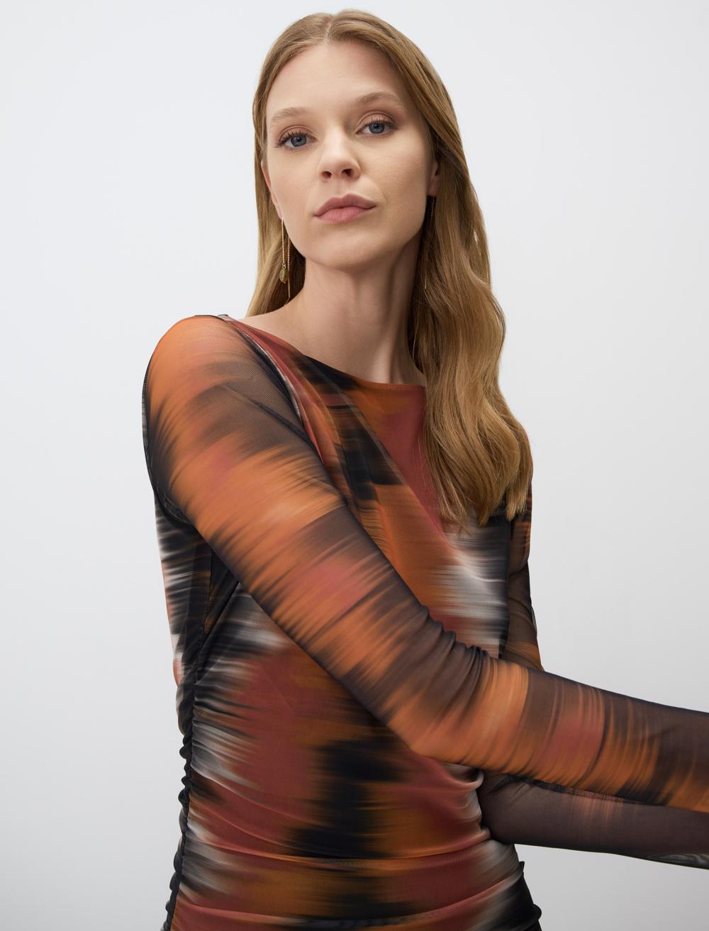 Slim Fitted Boat Neck Patterned Knitted Mesh Dress
