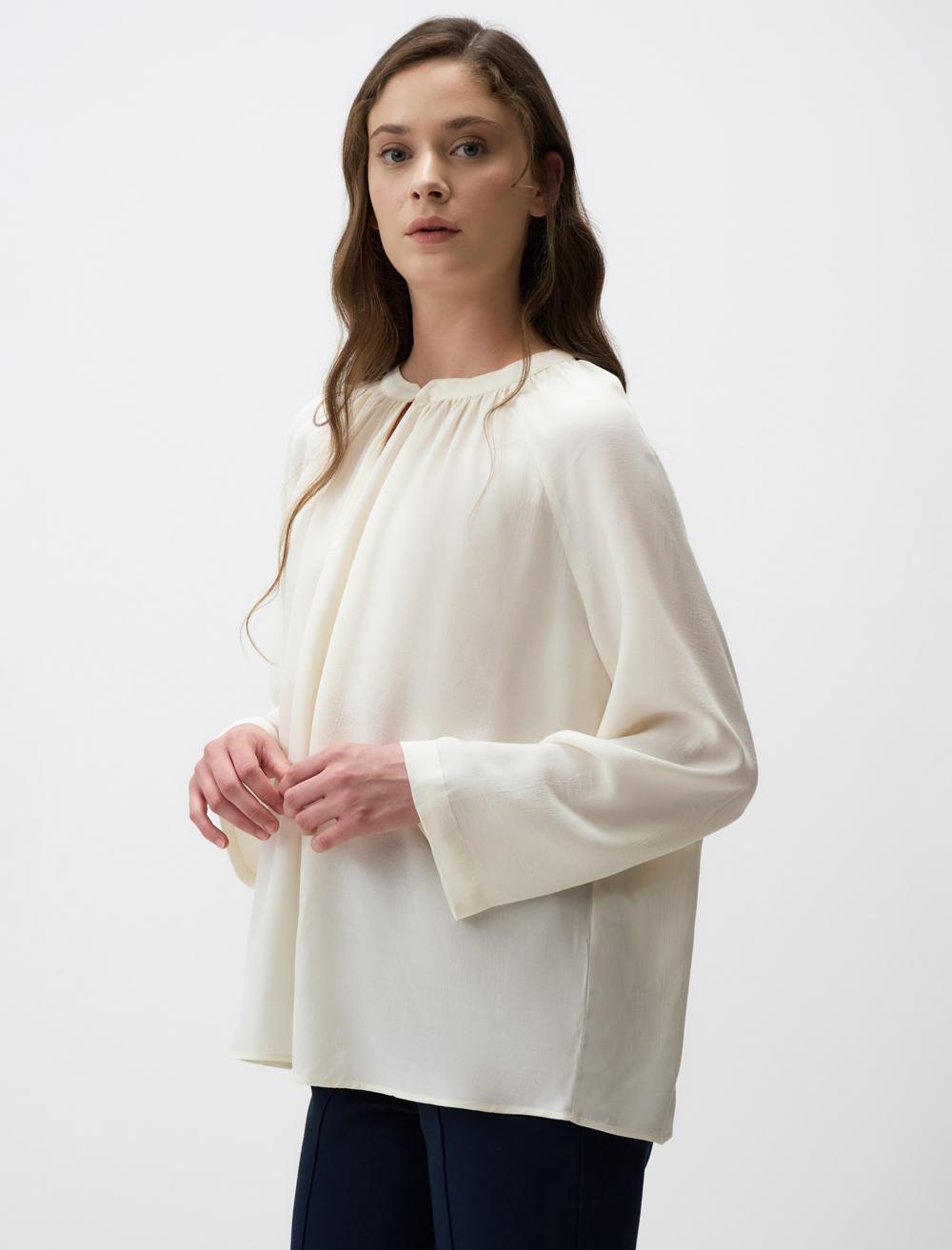 Woman Textile Top Wear ECRU Blouse Loose fit Crew neck Long Sleeve ECRU Blouse No chlorine bleach, Dry clean, Do not tumble dry, Machine and hand wash at 30°C, Wash and iron inside out %100 Polyester Model Height 176 cmModel Breast 86 cm Model Waist 62 cm Model Hips 90 cm Model Size Model Size S