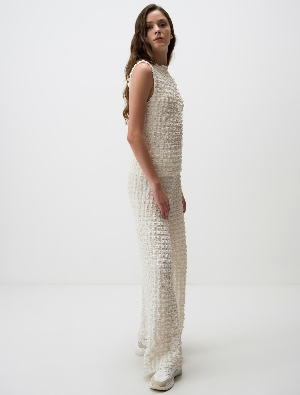 Woman Textile Bottom Wear ECRU Trousers Loose fit High Waist ECRU Trousers No chlorine bleach, Dry clean, Do not tumble dry, Machine and hand wash at 30°C, Wash and iron inside out %99 Polyester %1 Elastane Model Height 175 cmModel Breast 86 cm Model Waist 63 cm Model Hips 90 cm Model Size Model Size S