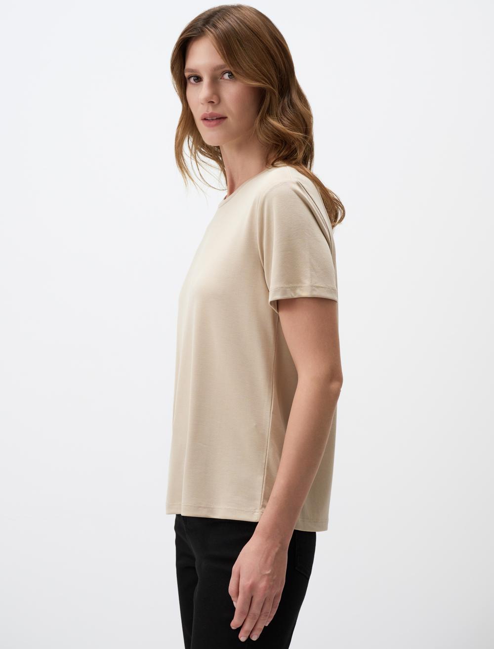 Woman Textile Top Wear BEIGE T-shirt Regular Fit Crew neck Short Sleeve BEIGE T-shirt No chlorine bleach, Dry clean, Do not tumble dry, Machine and hand wash at 30°C, Wash and iron inside out %78 Modal %22 Polyester Model Height 175 cmModel Breast 86 cm Model Waist 63 cm Model Hips 90 cm Model Size Model Size S