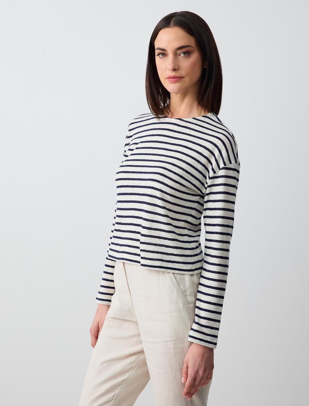 Crew Neck Long Sleeve Line Patterned Linen Knitted T-Shirt