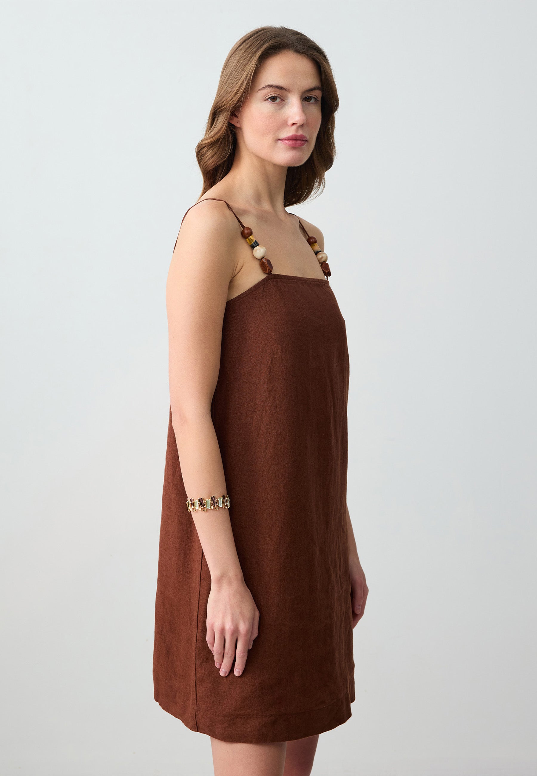 Woman Textile Biiter Brown Dress, Regular Fit Spaghetti straps Biiter Brown Woven Dress, %100 Linen