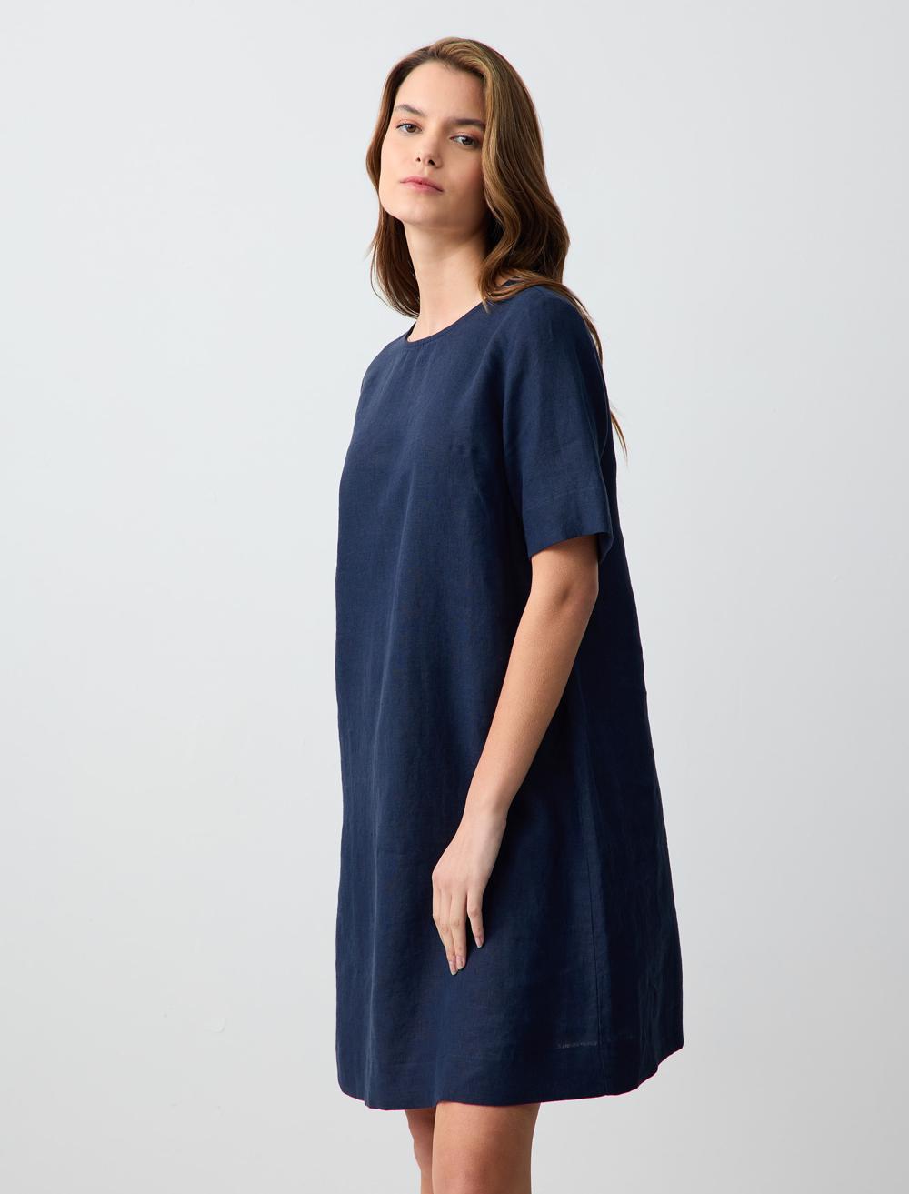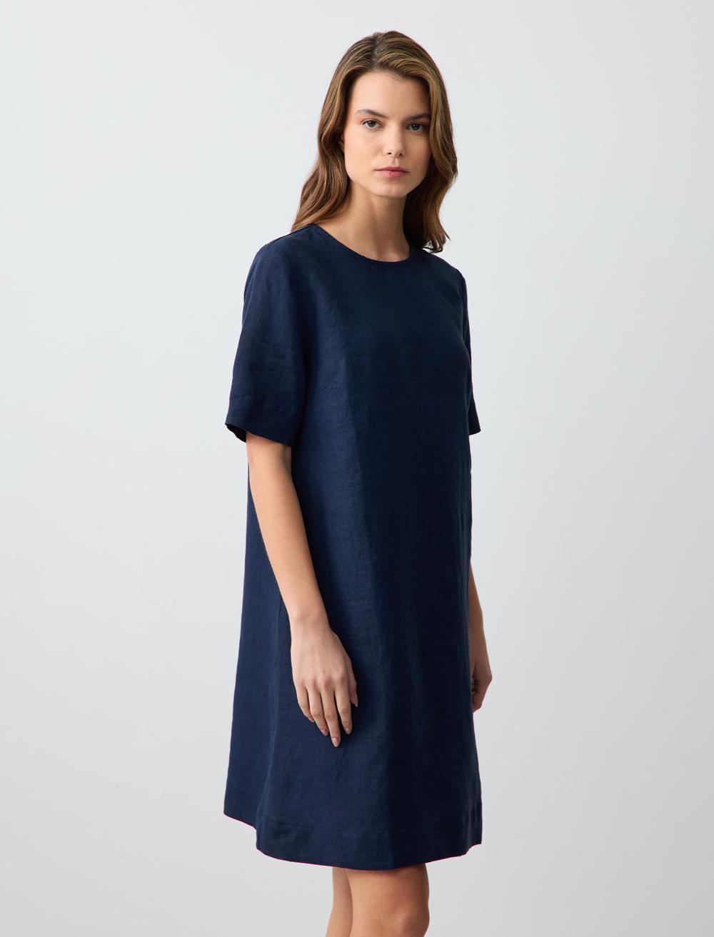 Normal fit Crew neck Short Sleeve Short Woven Dark Blue Dress Fabric: %100 Linen Fit: Regular Fit Crew neck Length: Short S Model Size: 176 86 cm 62 cm 90 cm