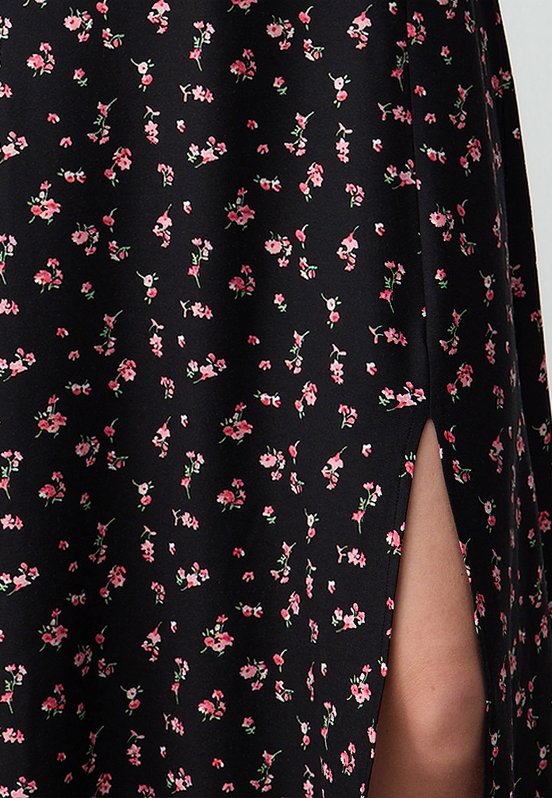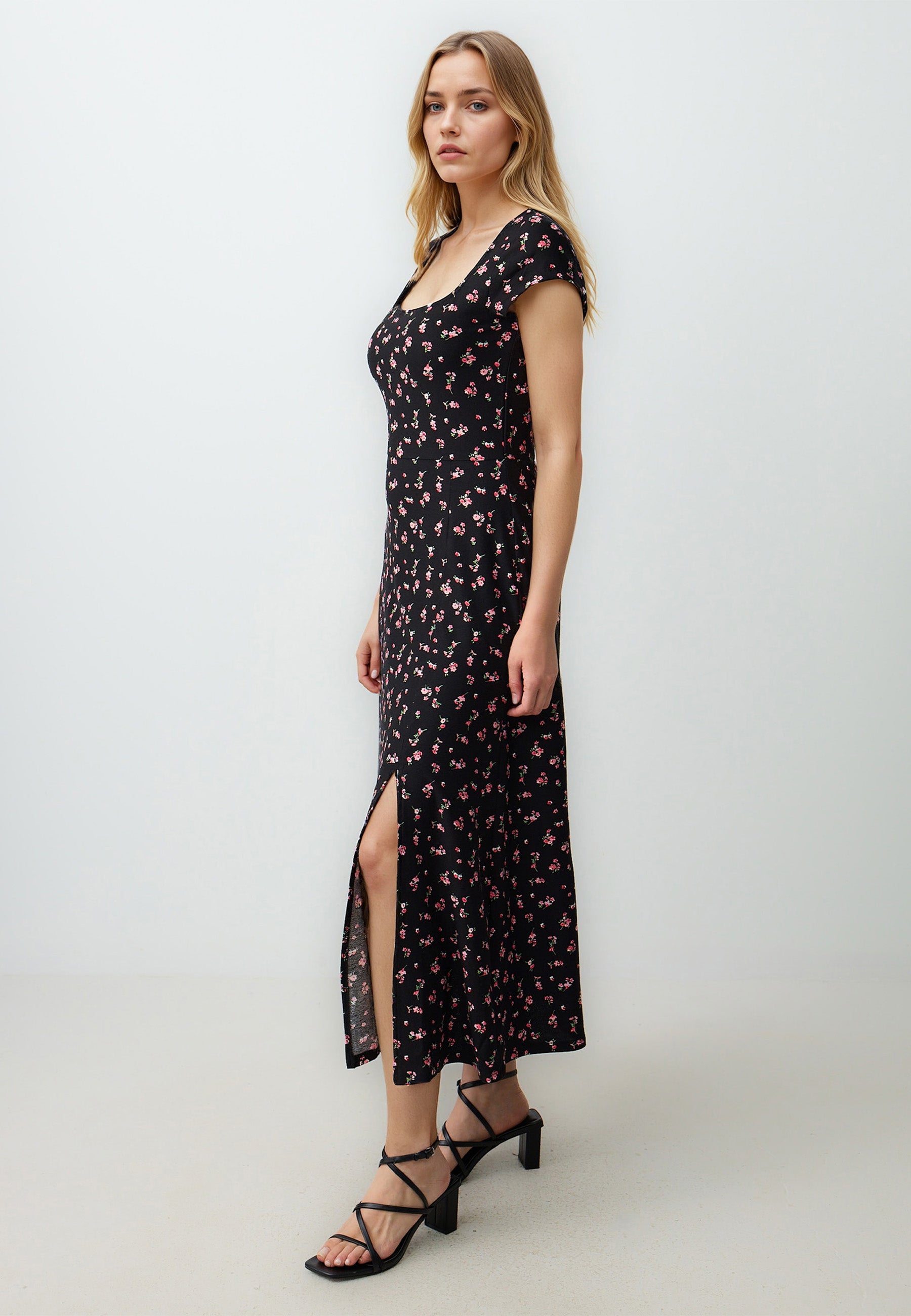 Floral Patterned Slit Square Neck Short Sleeve Knitted Midi Dress