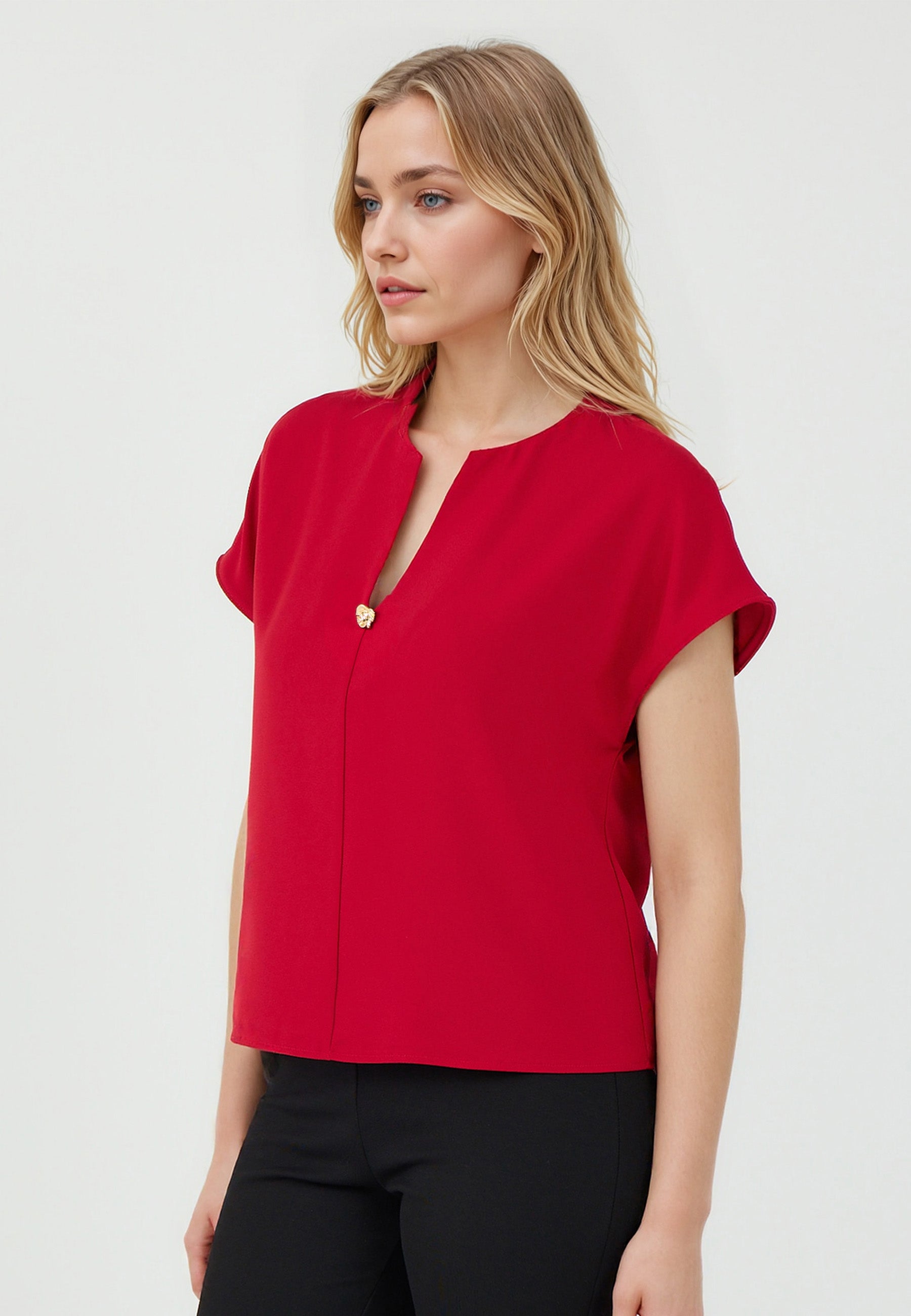 Regular Fit V-Neck Short Sleeve Regular Length Red Woven Blouse